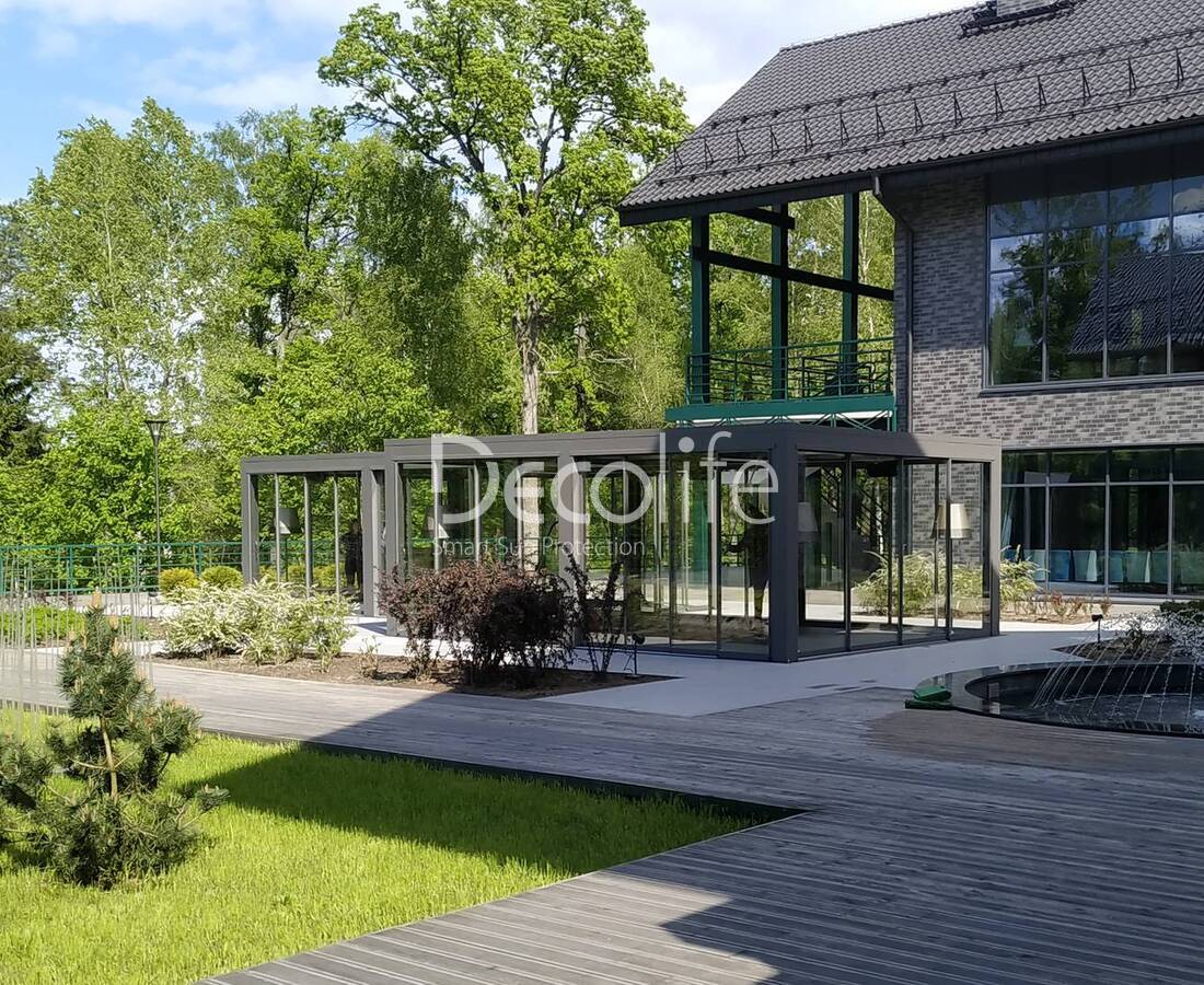 Пергола Decolife Bioclimatic B500-25П + Гильотинное W500 и Раздвижное S150 остекление + Стеклянное ограждение B50 - г. Браслав